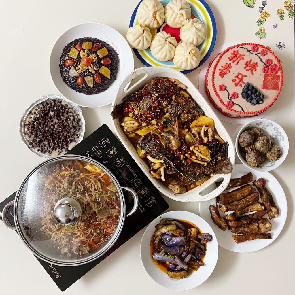我廚藝不好,弟兄又忙的不可開交,所以今年的年夜飯我們決定在餐館定幾個喜歡吃的菜,也算共度新年了。在網上找了一家不錯的川菜館點了三個菜:麻辣烤魚、飘香肥羊、魚香茄子,没想弟兄姐妹送来了好多好吃的,年糕、八宝饭、烤排骨、香菜牛肉丸子、还有热腾腾的包子、加上一個新年的蛋糕,感謝主!